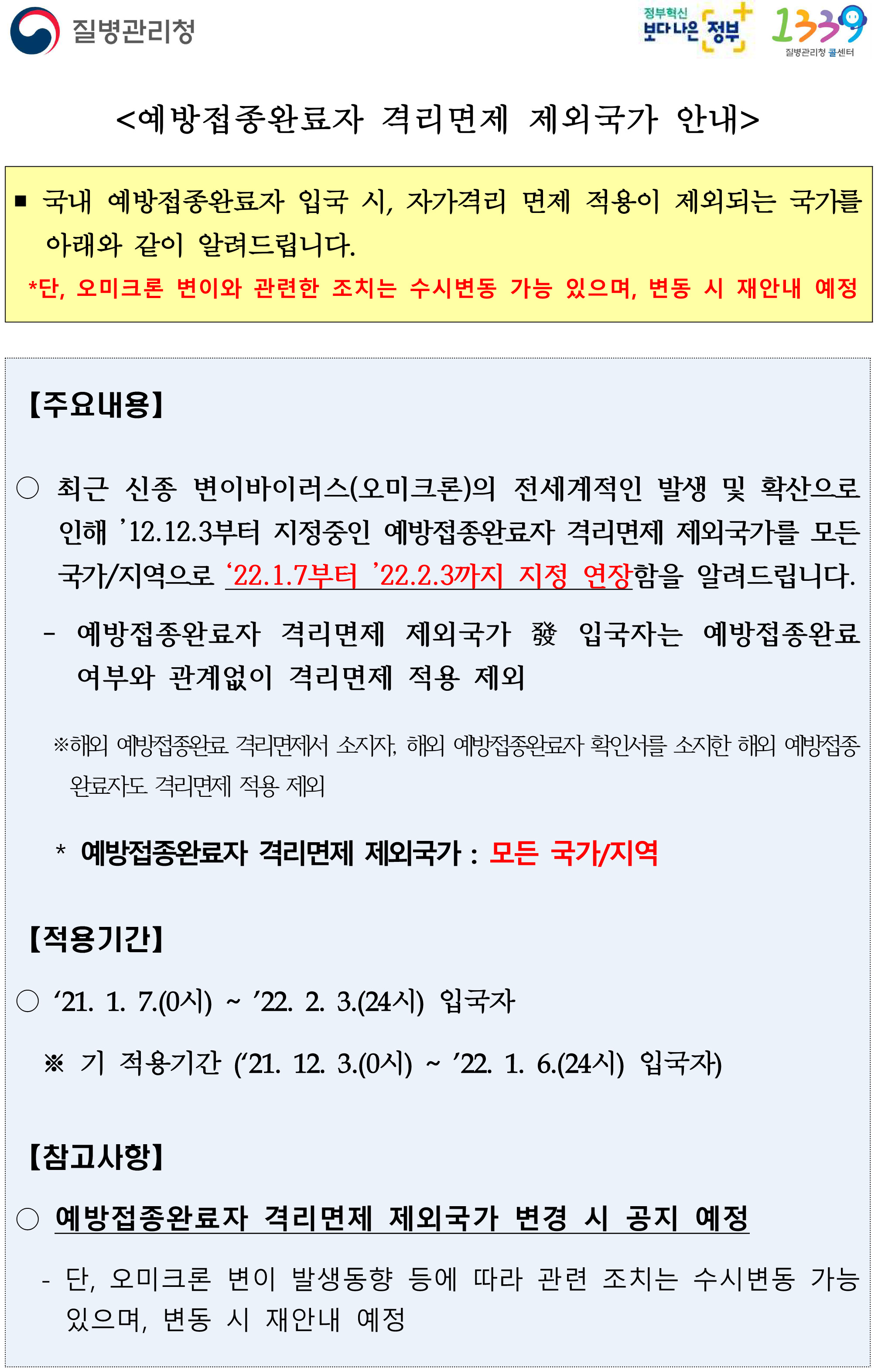 - 프로그램 진행하는 나라들이 델타변이 위험국가였기 때문에 원래도 자가격리 면제 제외 국가였지만 추세가 오미크론으로 넘어가고 있어서 현행 방침인 모든 국가 자가격리 면제 제외가 풀리면 별도 지정이 풀릴 수도 있다는 점.
