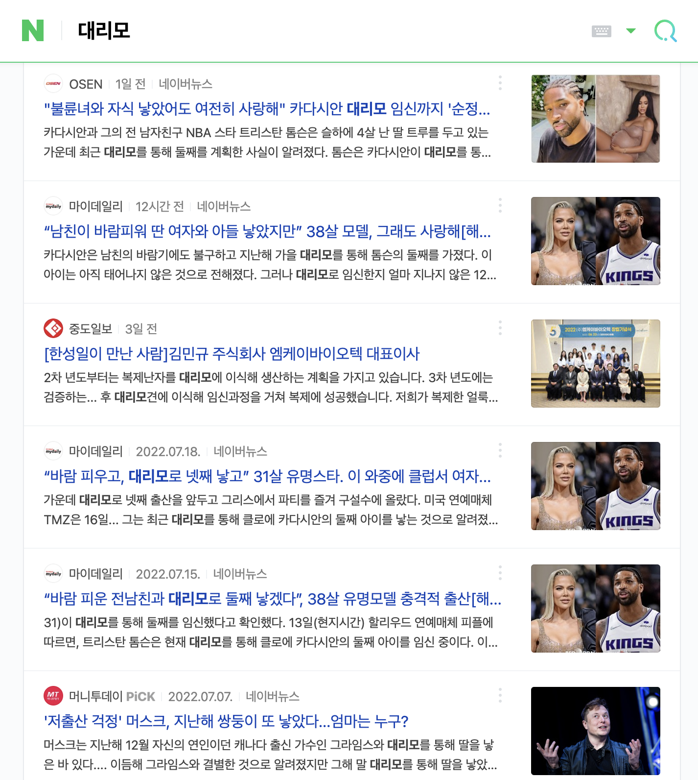 작성일인 오늘, 2022년 7월 27일자로 네이버 뉴스에 대리모로 검색하면 나오는 기사들